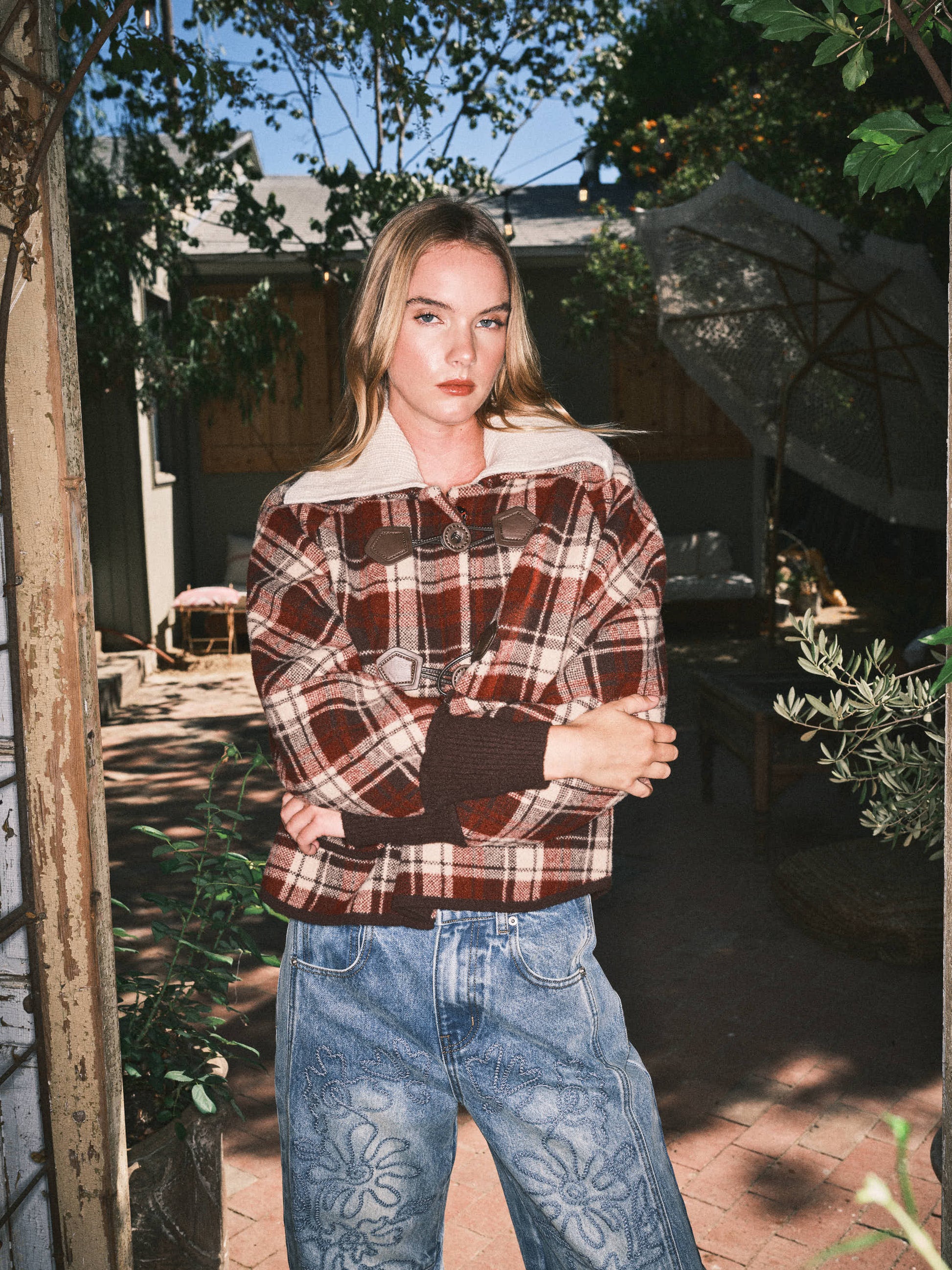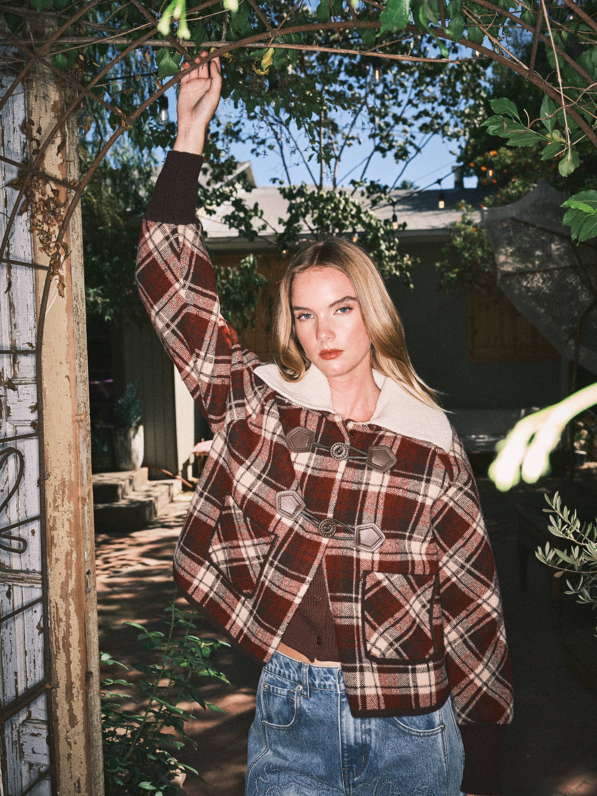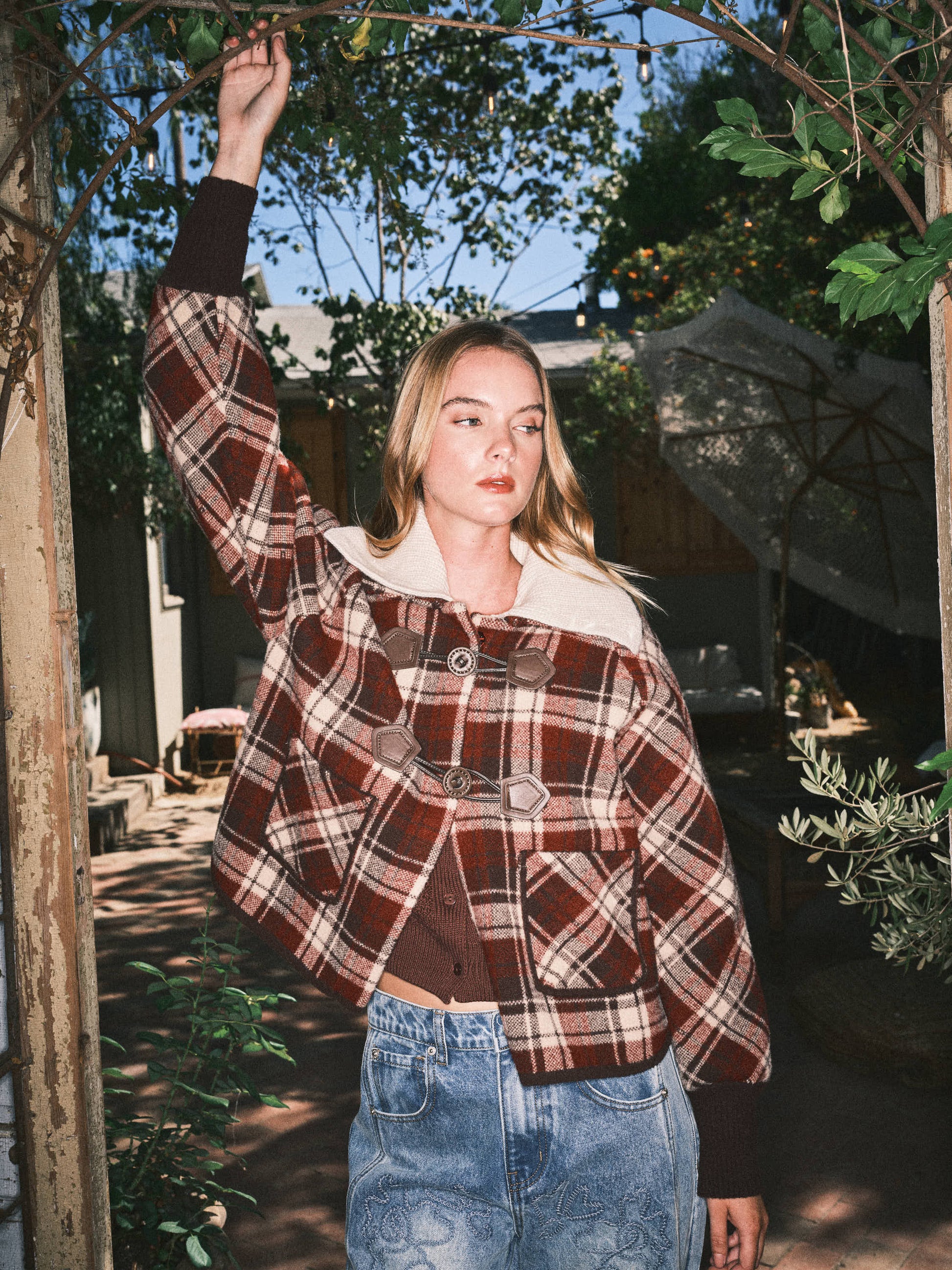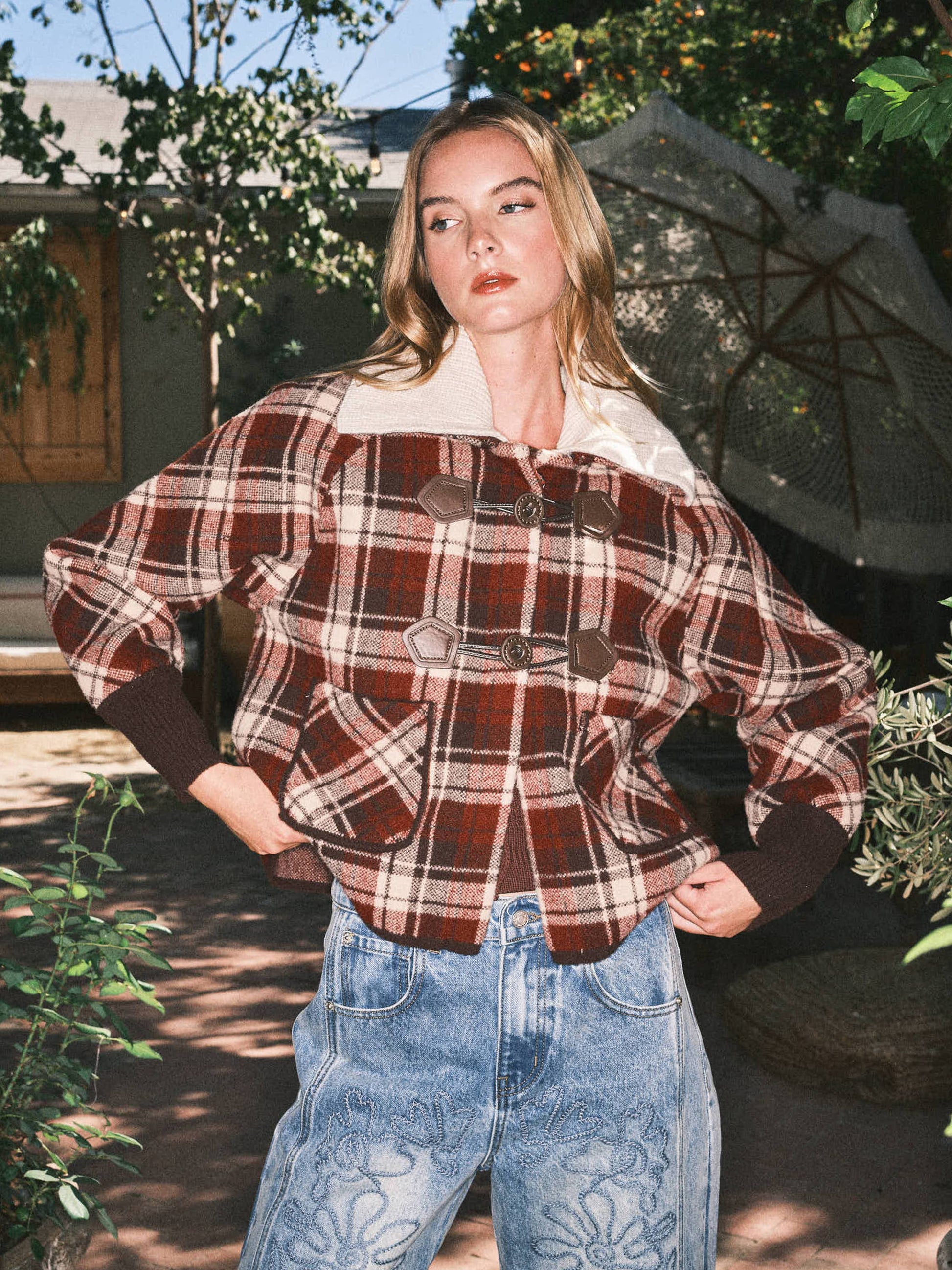This duffle coat inspired sweater jacket featuring a classic plaid print and detachable collar for versatile styling. Designed with signature toggle buttons and ribbed cuffs, it offers a timeless outerwear look with the comfort of a knit. A perfect statement piece for cooler days. -Classic plaid print -Detachable collar for versatile wear -Signature toggle buttons (duffle coat style) -Ribbed cuffs for a snug fit -Soft, cozy knit fabric