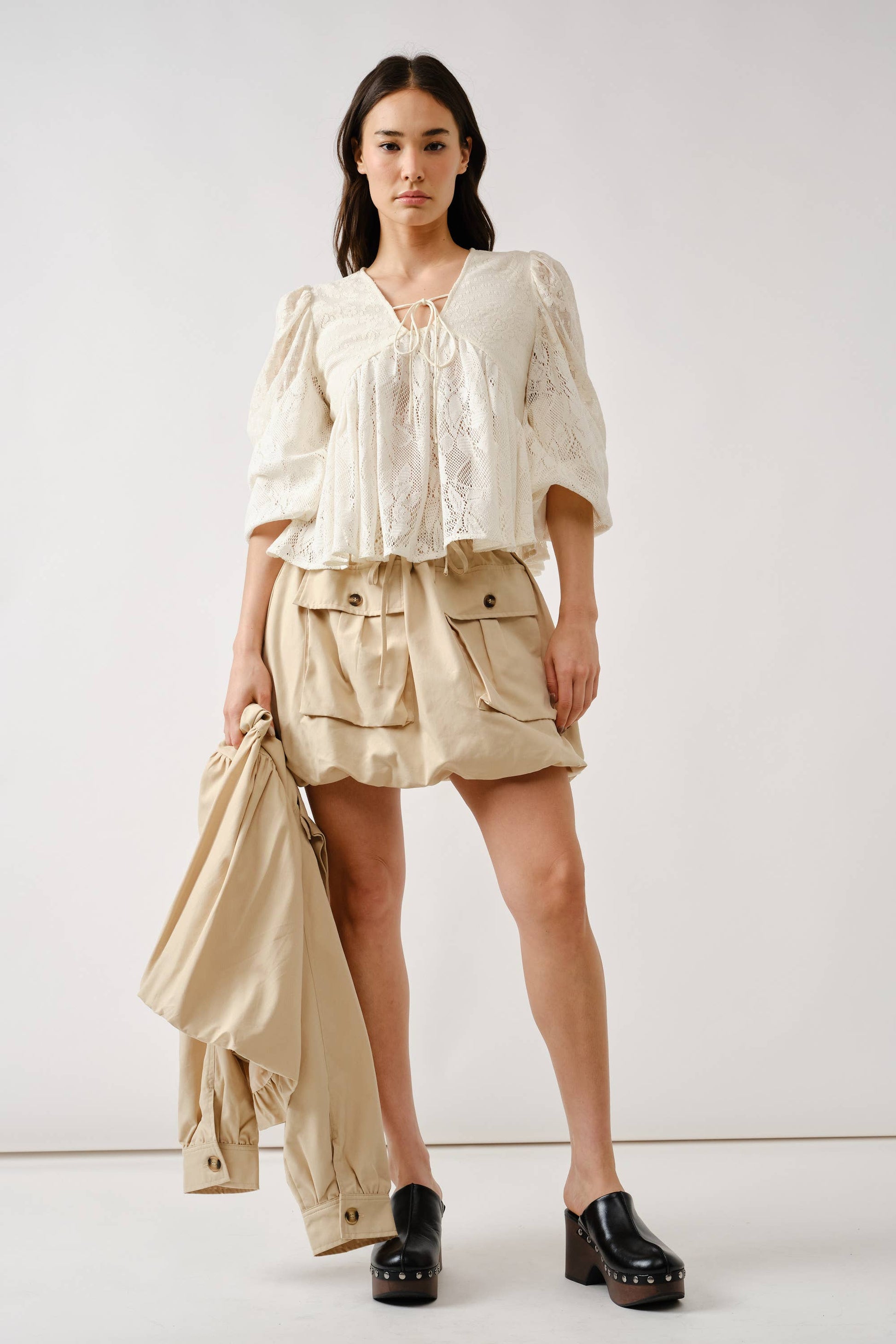 -Relaxed babydoll silhouette -V-neck with adjustable tie -Elasticated sleeve cuffs