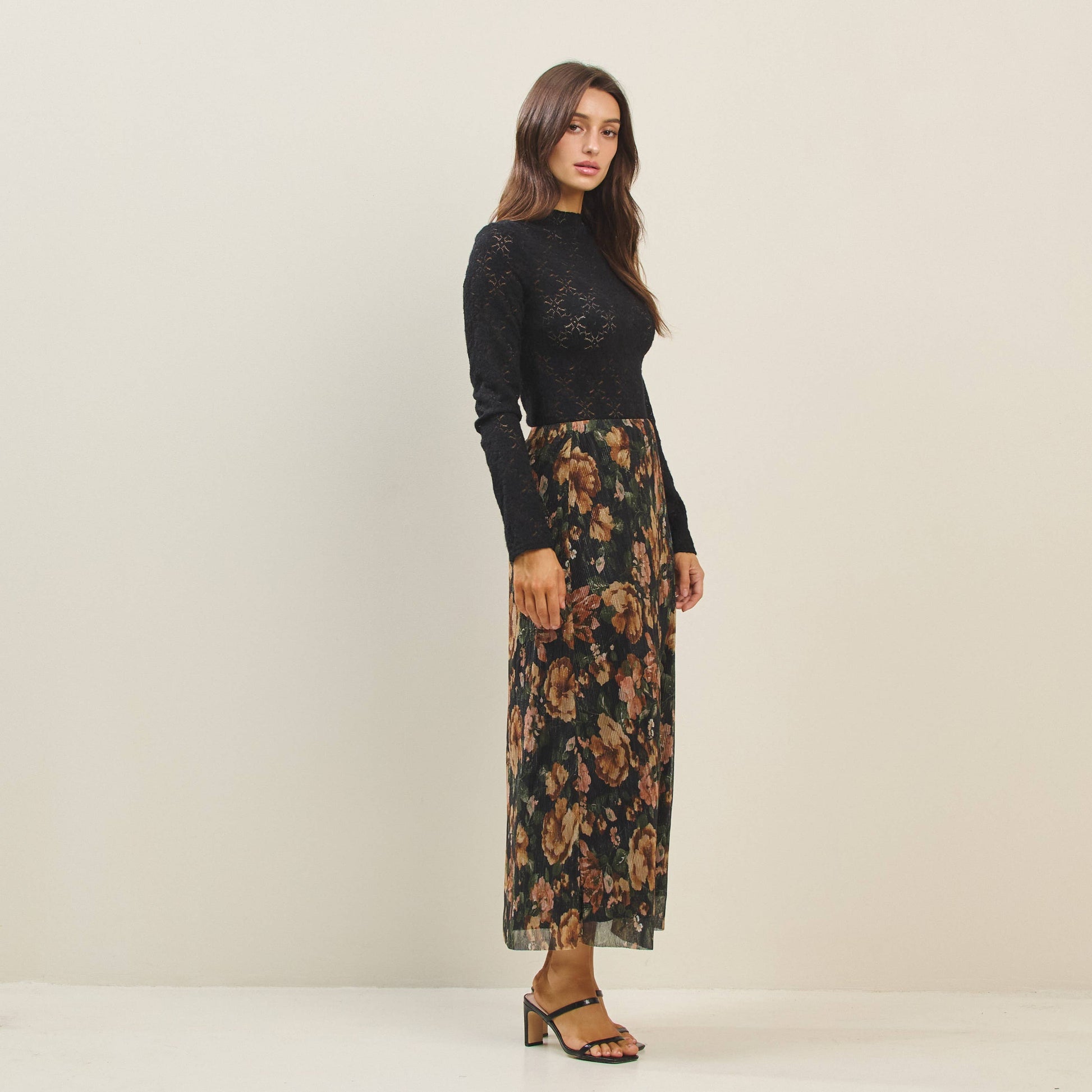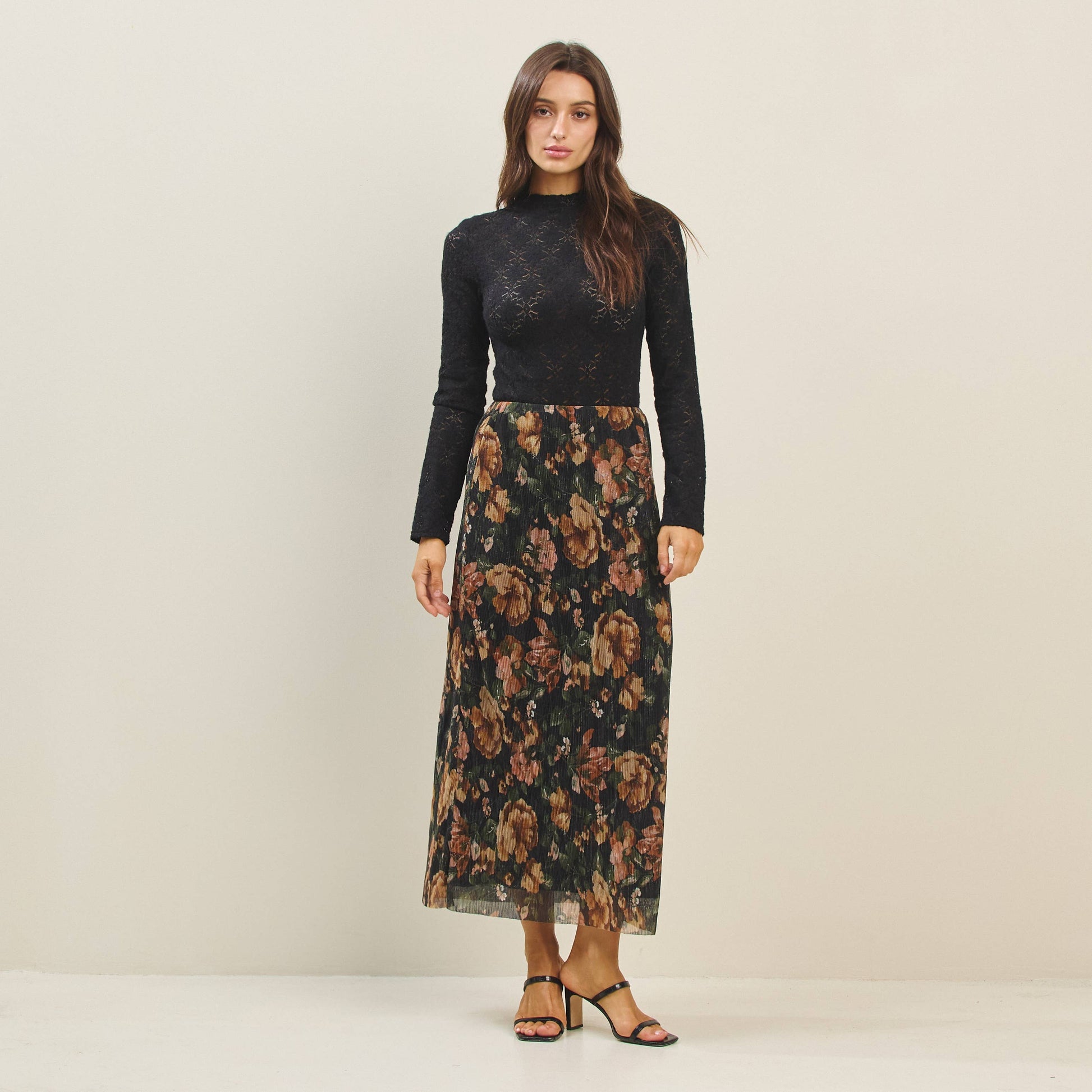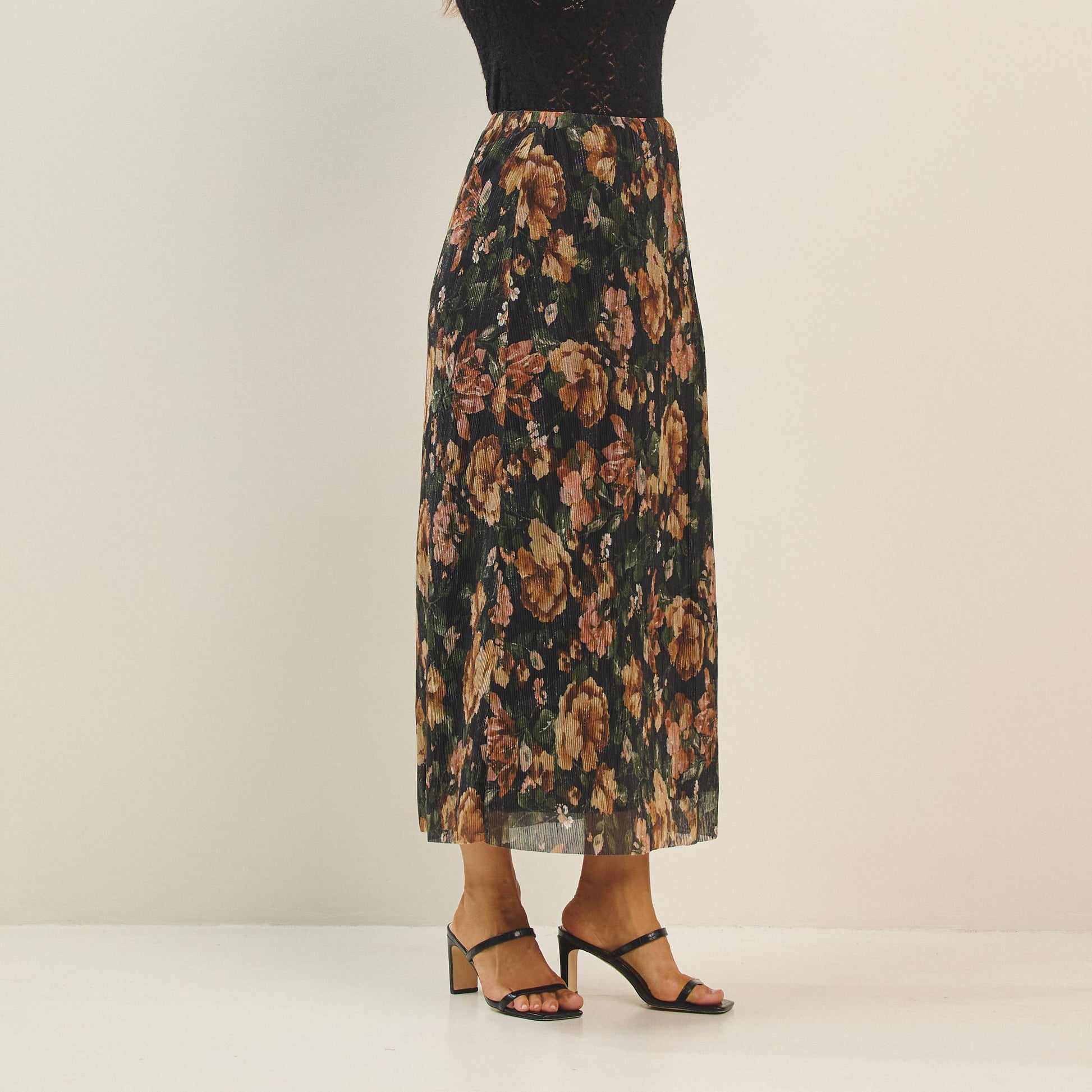 Fully lined fluted metallic floral maxi skirt with elastic waist.