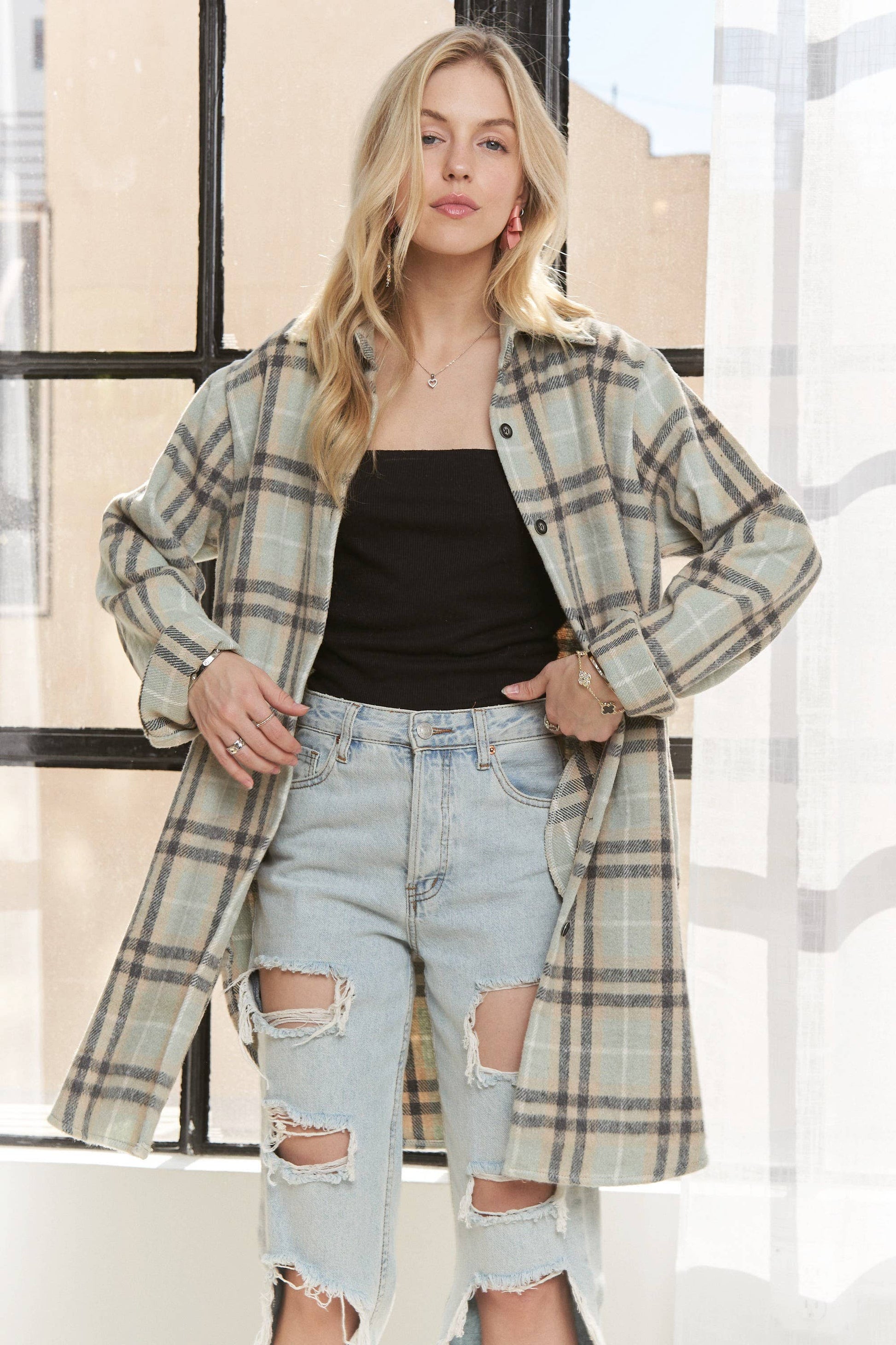 PLAID BUTTON UP FLANNEL SHACKET WITH POCKETS