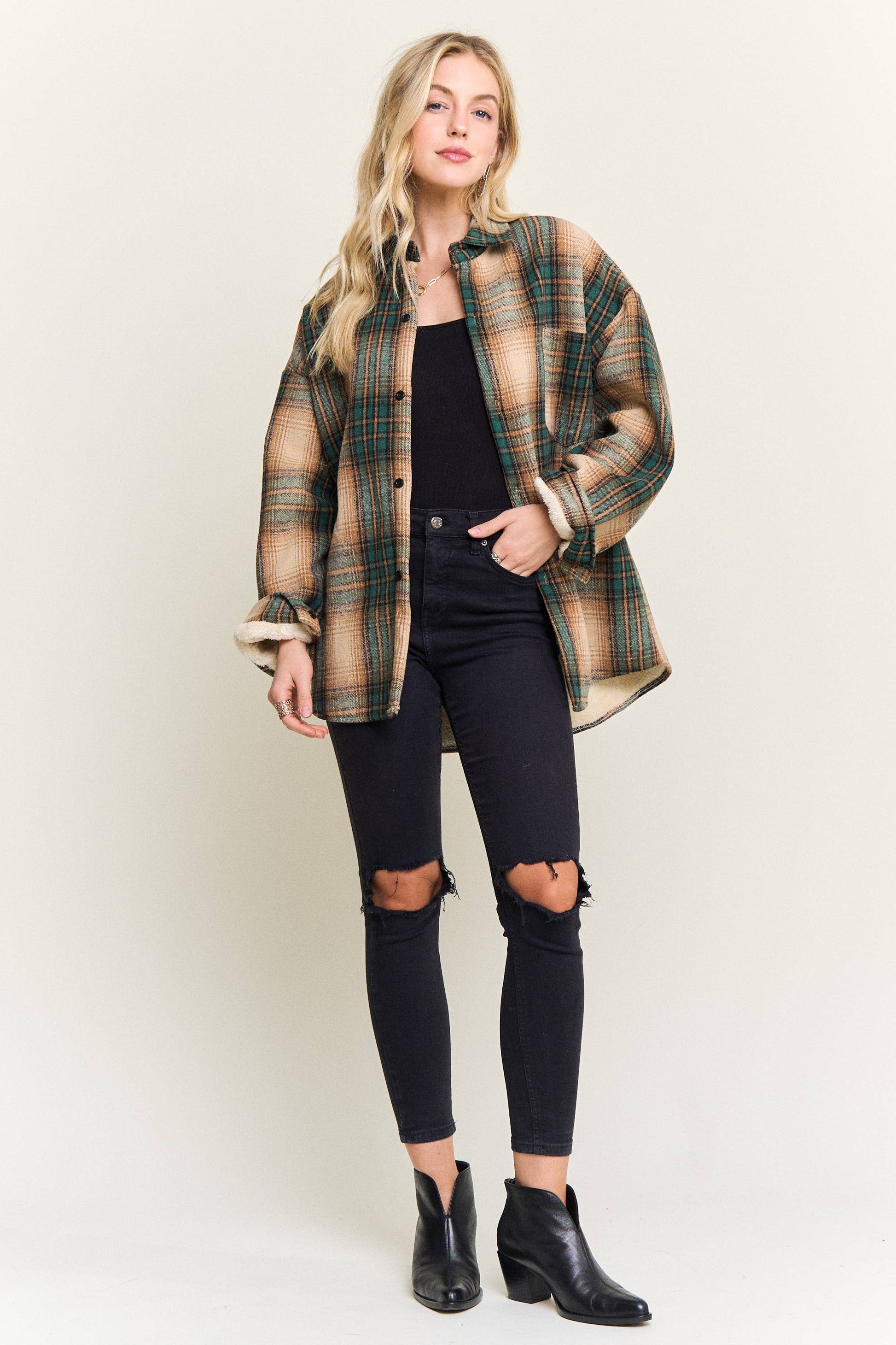 Ultra soft sherpa fleece lined flannel shacket. Crafted from a blend of 80% polyester and 20% cotton, it provides both durability and comfort. The exterior features a classic plaid pattern, while the interior is lined with soft sherpa for exceptional warmth. Its button-down design allows for versatile wear, whether buttoned up or left open over another top.