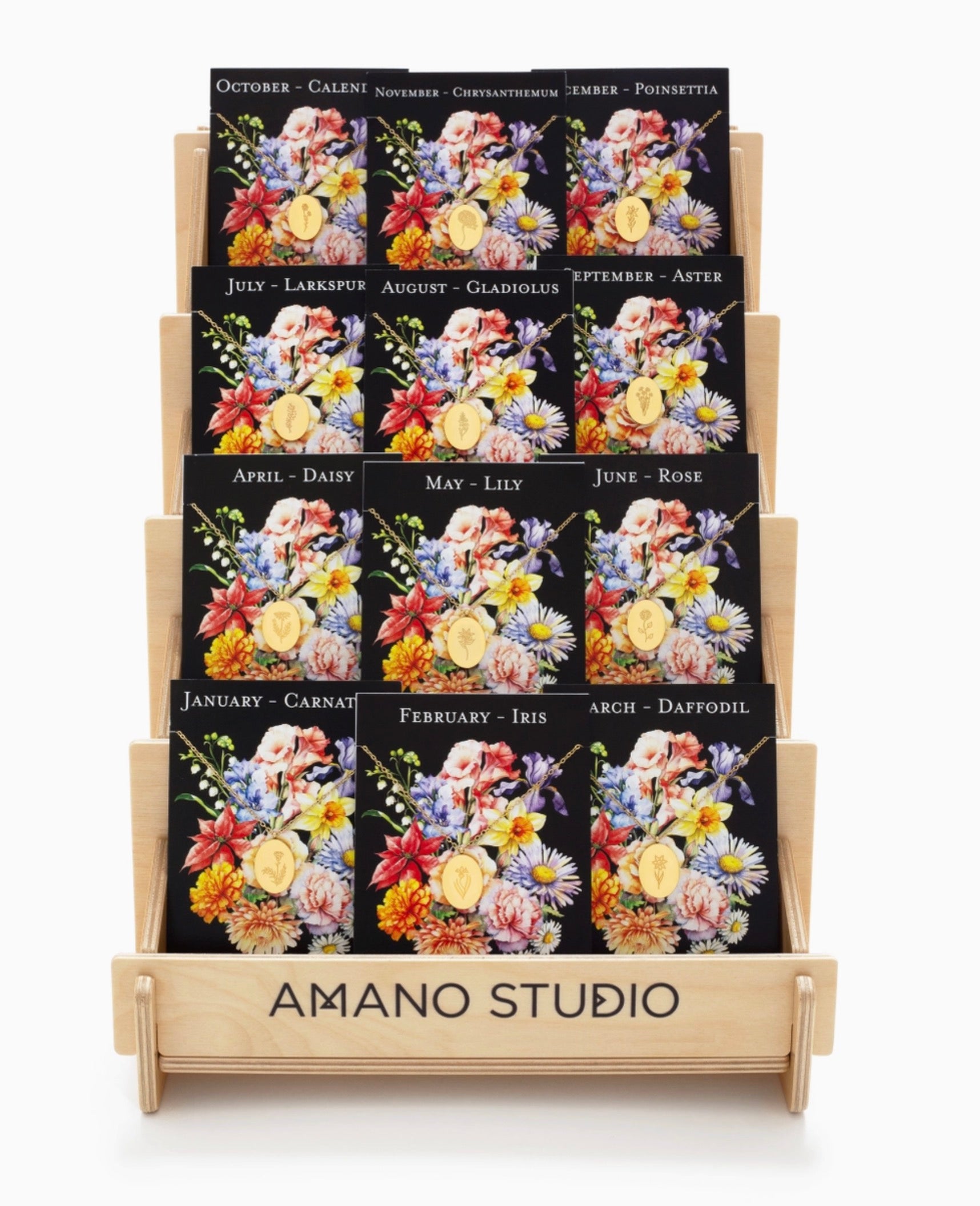 The oval pendant measures .75 x .5 inches and hangs from a 16" chain with a 2" extender. Made of 14k gold plated stainless steel. They are carded on a gorgeous "dark academia" flower seed style card. Assembled in our Sonoma California studio.