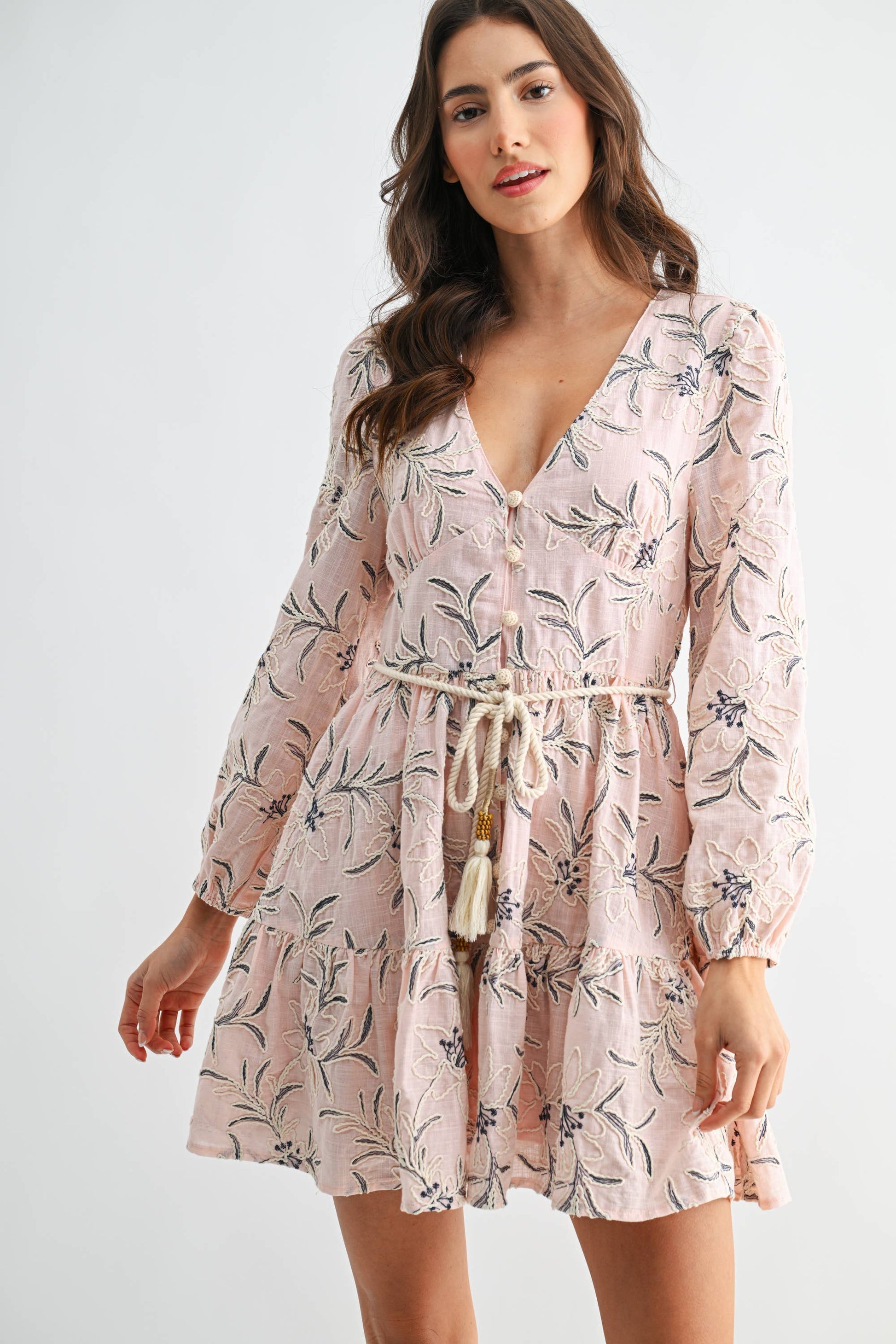 Introducing a refined mini dress tailored for sophisticated wardrobes. This embroidered floral belted dress showcases exceptional craftsmanship, ideal for corporate gatherings or upscale events. The thoughtful silhouette features tailored long sleeves and a subtle flared skirt, offering a polished yet distinctly feminine aesthetic.