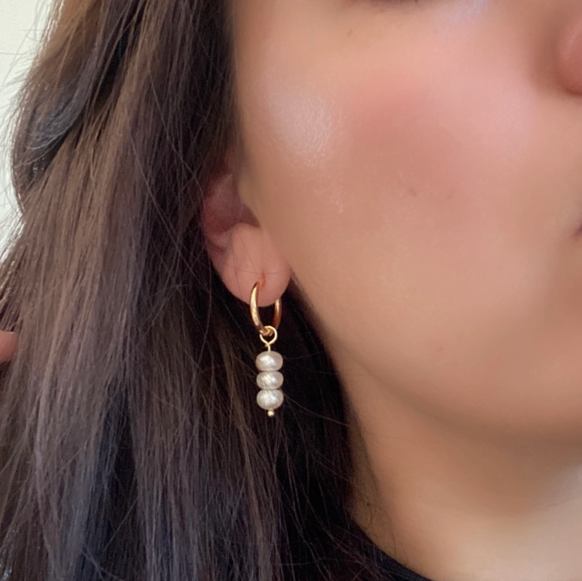 ⭑ Gorgeous Dangle Earrings handmade of 14k Gold Plated Hoops + 3 oval freshwater Pearls. They can be worn in two different ways, just like you see them pictured or removing the pearls charm for a sleek look. ⭑ Measures: About 2" drop. ⭑ Great for your everyday looks! ⭑ Waterproof/ Water resistant 💦 • Made in United States