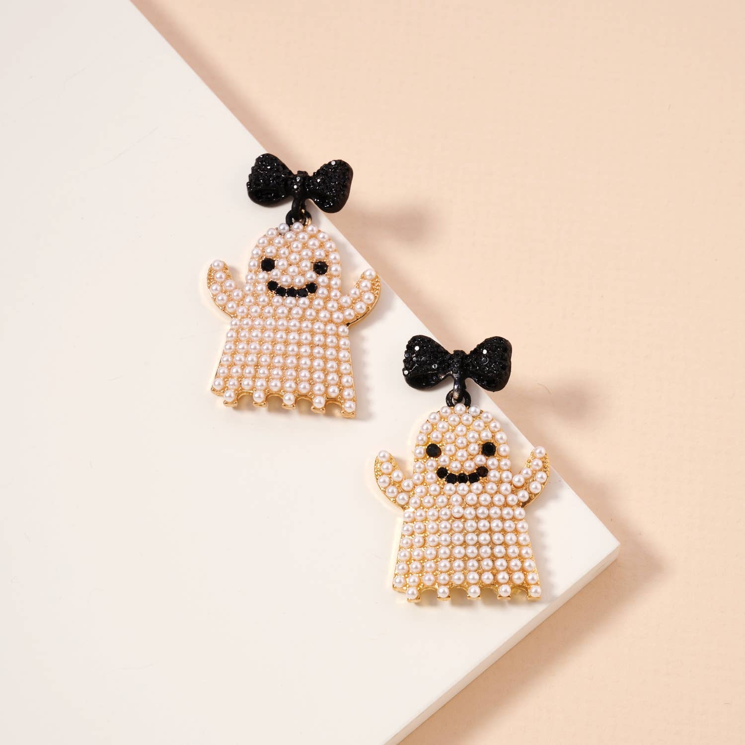 Elevate your Halloween style with our Bougie Boos Dangling Earrings decorated with pearls and black rhinestones on the bow. Perfect for Halloween parties or adding a festive touch to your everyday look.