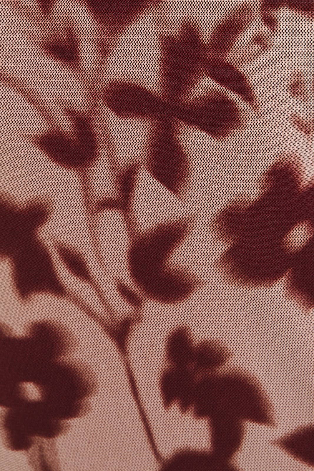 Round neck, bell sleeve flare hem floral mini dress. Mesh overlay, lined.