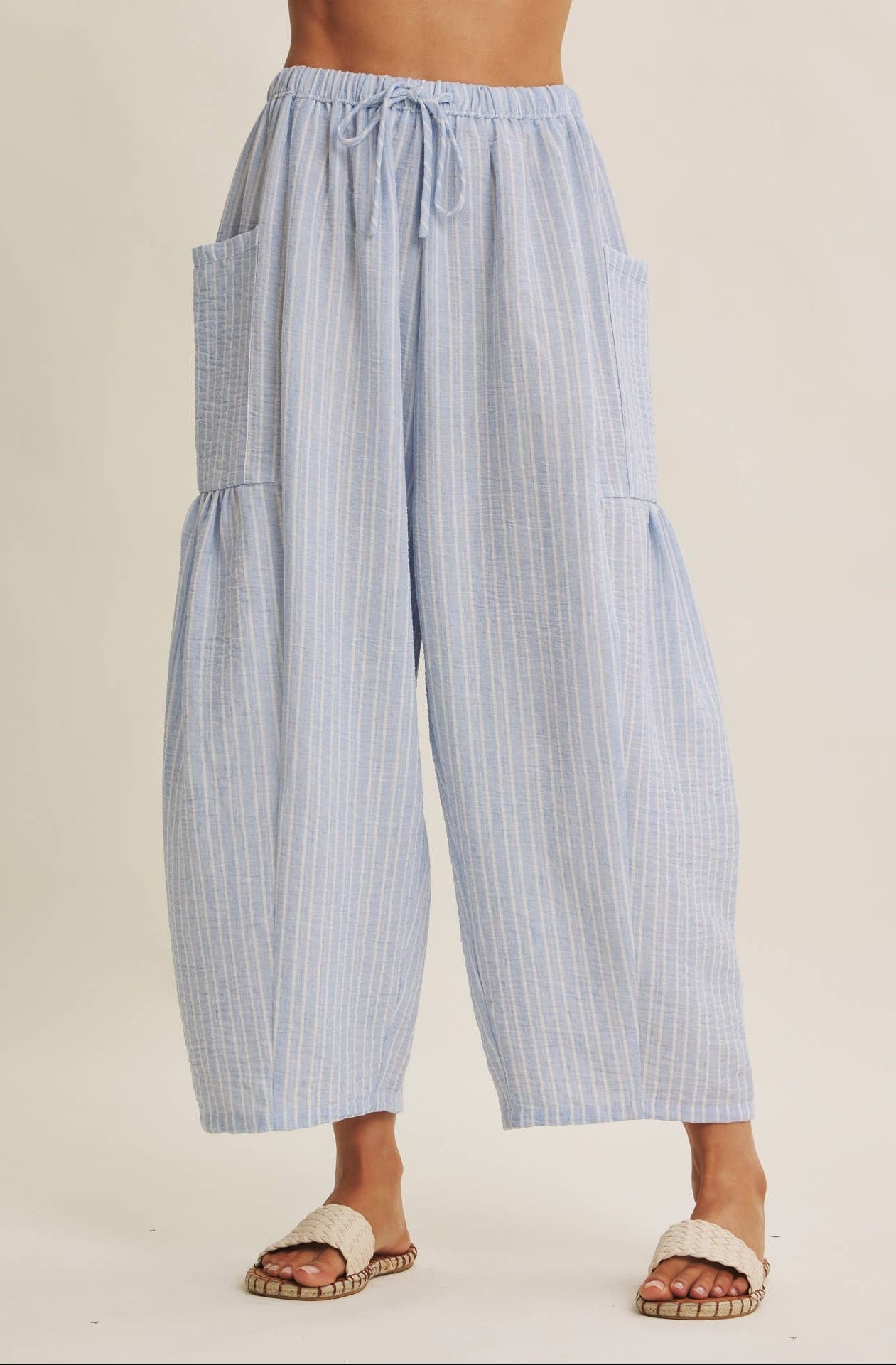 An effortlessly relaxed pant designed for warm-weather ease and everyday wear. Featuring a soft stripe pattern and a billowy, airy silhouette. The elastic waistband with adjustable drawstring offers a flexible, easy fit, while the dropped side pockets add a laid-back, functional touch. Designed to sit comfortably at the waist with a gently voluminous leg.