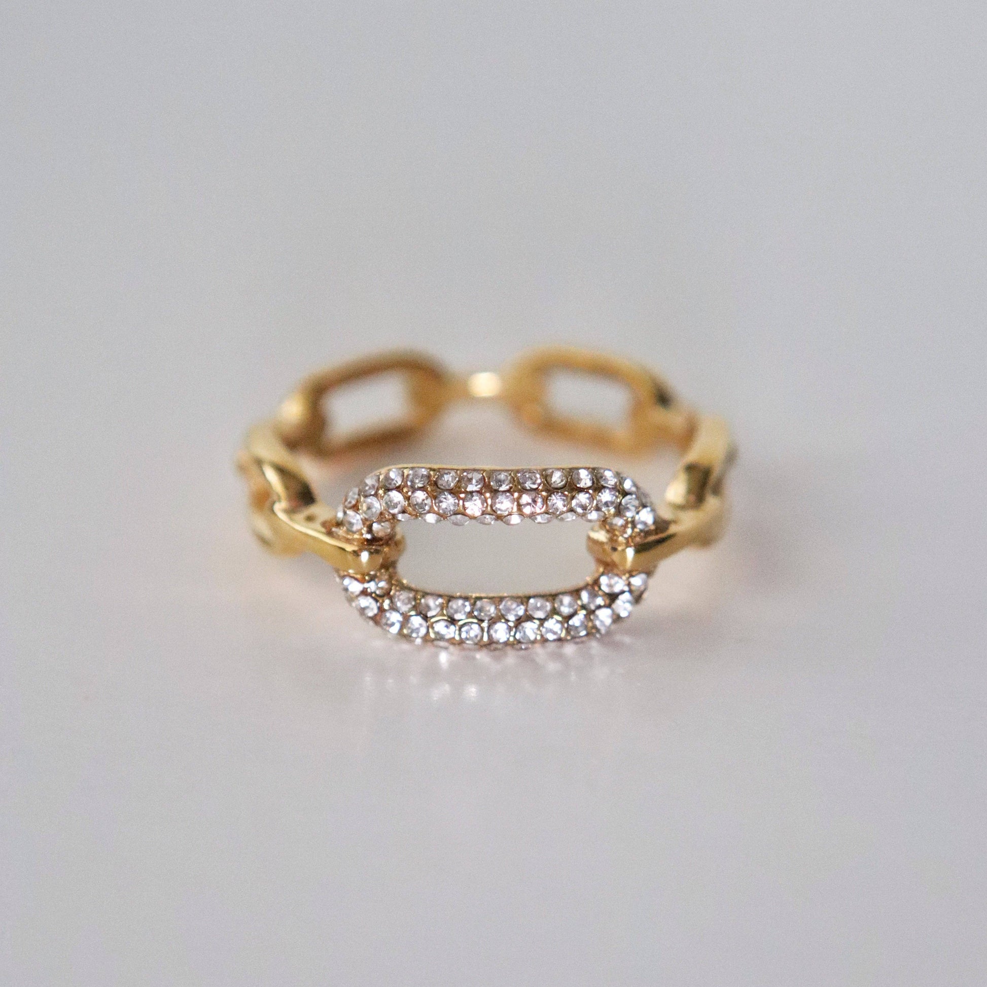Bring a fresh pop of sparkle to your look with the Pave Link Chain Ring. This ring features a chain link design highlighted by a single, pave link that catches the light just right. -stainless steel, 18k gold plated