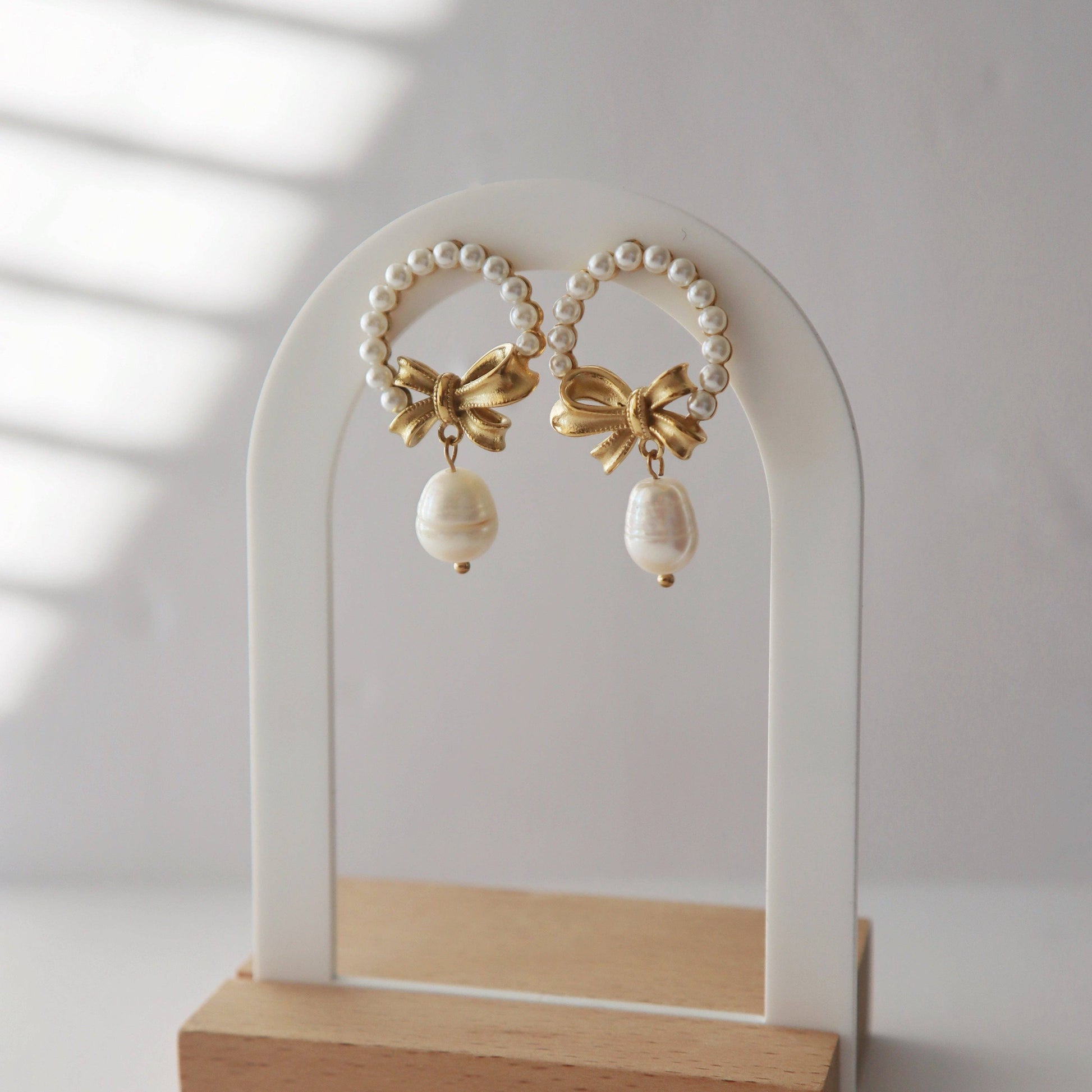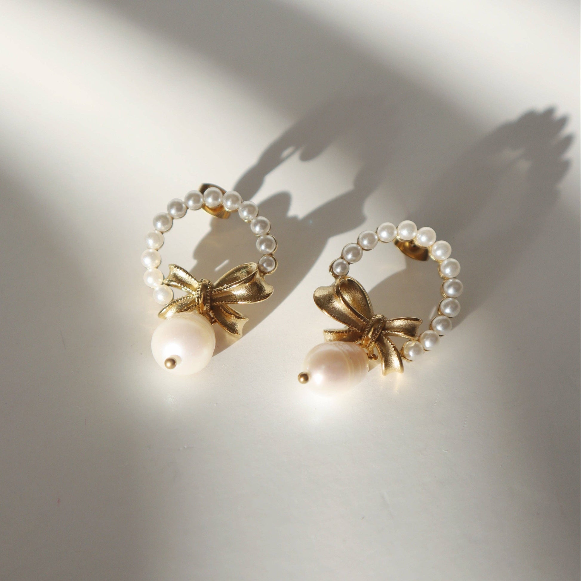 These earrings feature a delicate circle of tiny pearls reminiscent of a graceful halo, finished with a gold bow and a single pearl drop for a soft, romantic touch. Their design blends timeless elegance with subtle charm — perfect for the holidays yet refined enough for year-round wear. -stainless steel, 18k gold plated