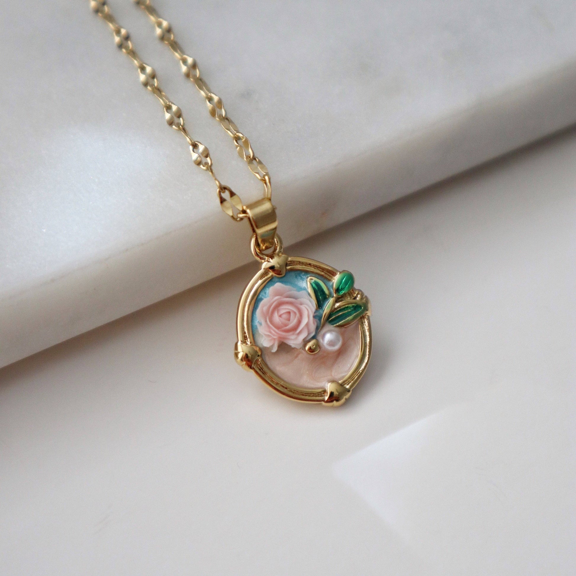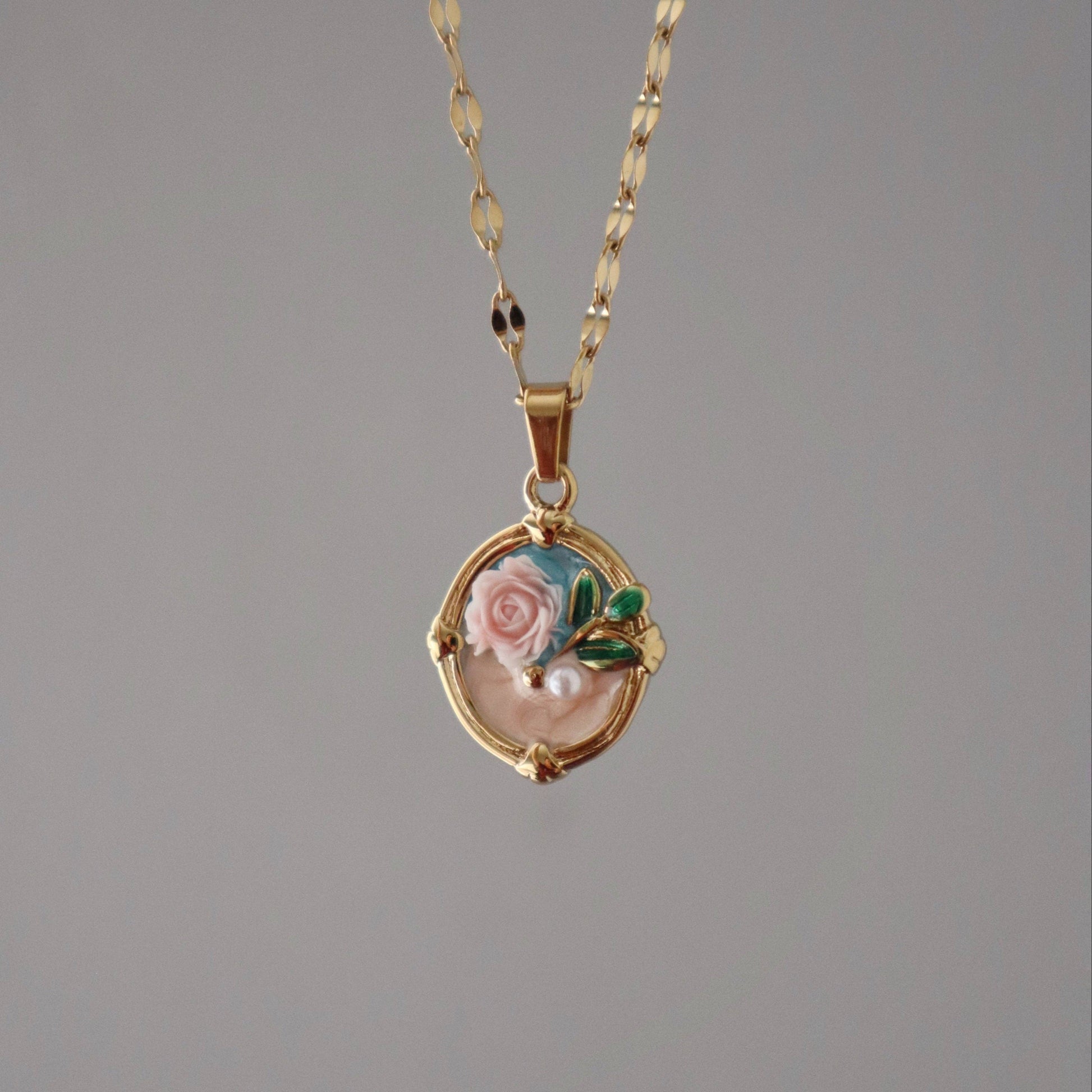 A delicate blend of vintage charm and modern romance, the Rose Bloom Necklace features a soft blush-toned rose with enamel leaf details and a subtle pearl accent.