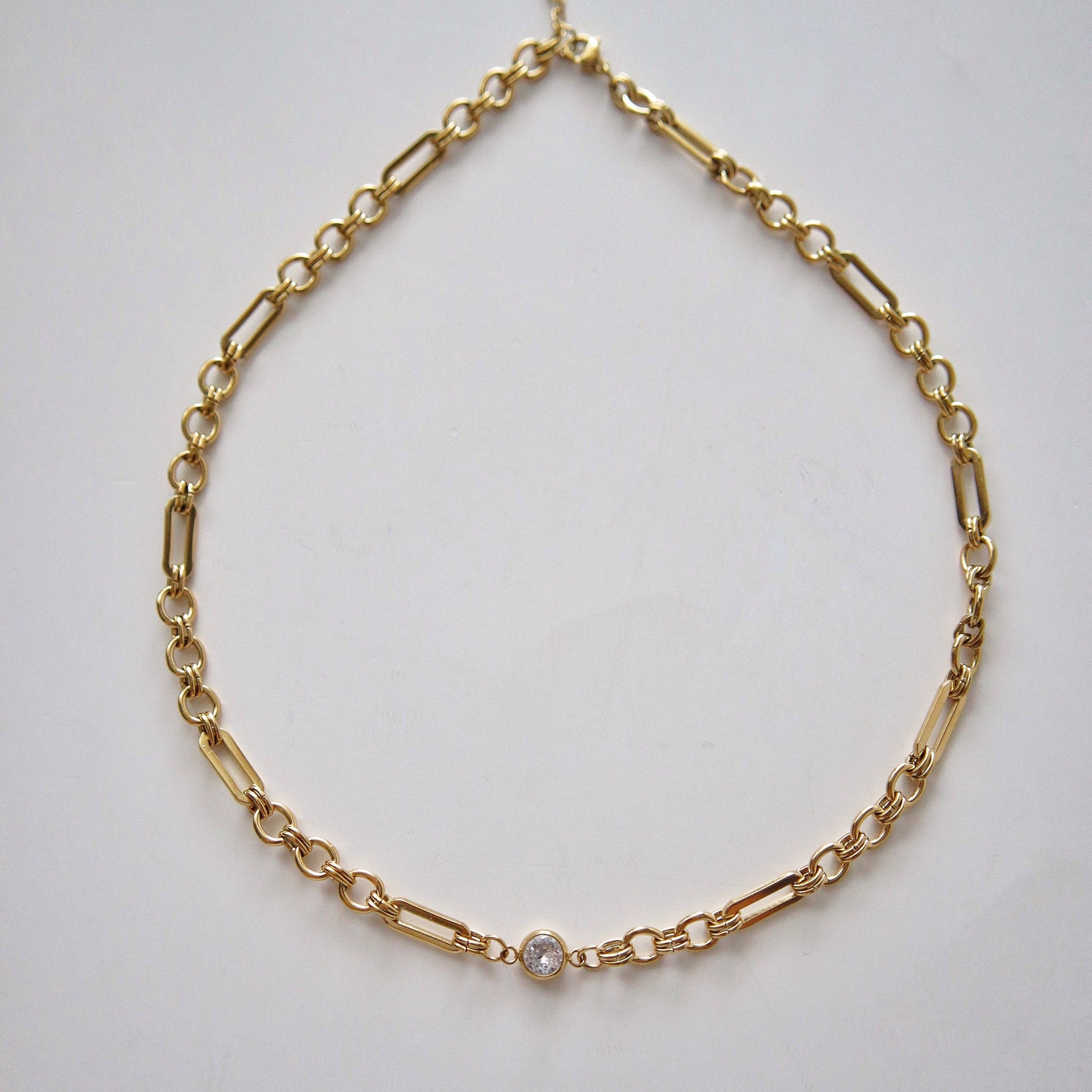 A modern twist on a medium-sized chain, the Solenne Chain Necklace features a single sparkling CZ bezel stone at its center. Sleek, versatile, and effortlessly chic, it’s the perfect accessory to help you stand out. -stainless steel, 18k gold plated -17.5" in length with 2" extender