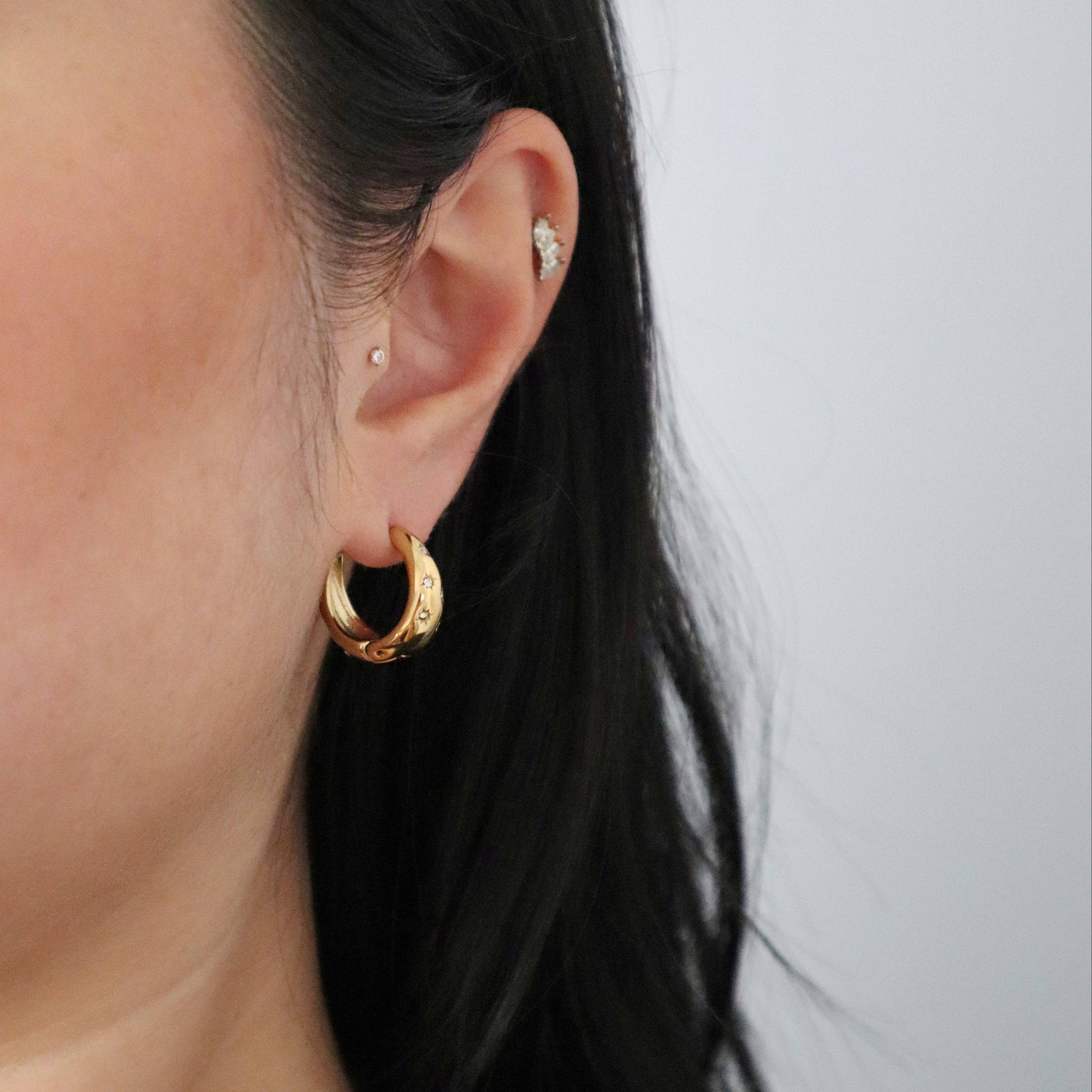 Classic dome hoops with a celestial touch. Hoops are accented with delicate CZ star details and CZ stones. Effortless, polished, and perfect for elevating your daily look. -stainless steel, 18k gold plated