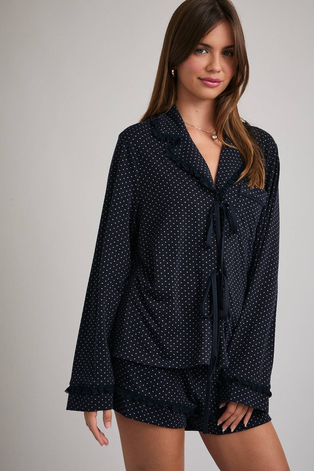 LE LIS - POLKA DOT KNIT PAJAMA TOP WITH LACE TRIM