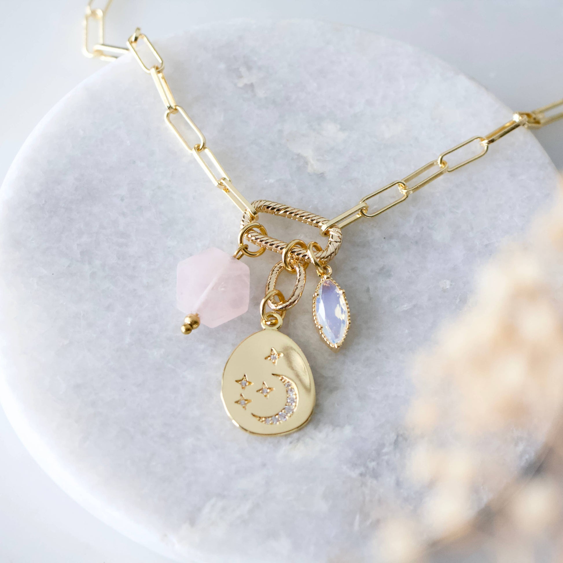Mesa Blue - Rose Quartz, Opalite Celestial Coin Charm Necklace