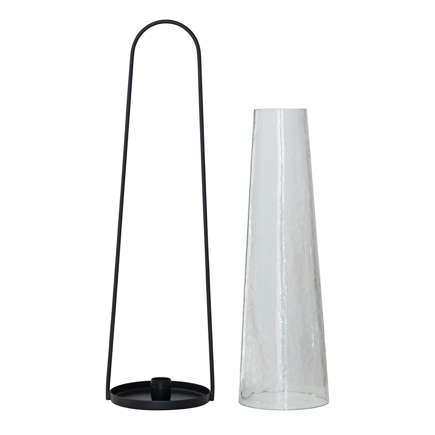4-1/2" Round x 17-1/4"H Metal Lantern Taper Holder w/ Handle & Hammered Glass Hurricane, Black, Set of 2