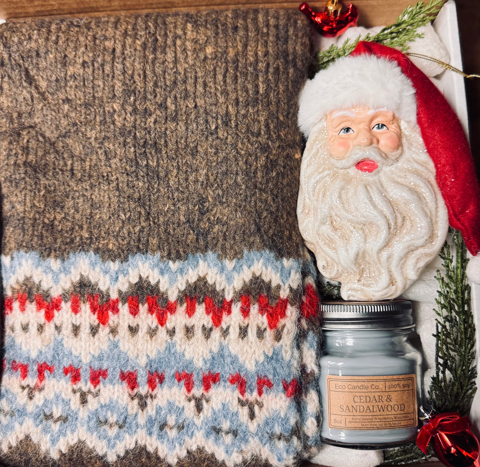 Small 12" x 13": Ultra soft oblong Fair Isle knit scarf, Eco Candle Company soy candle in scent Cedar & Sandalwood, Santa Ornament and embellishments..