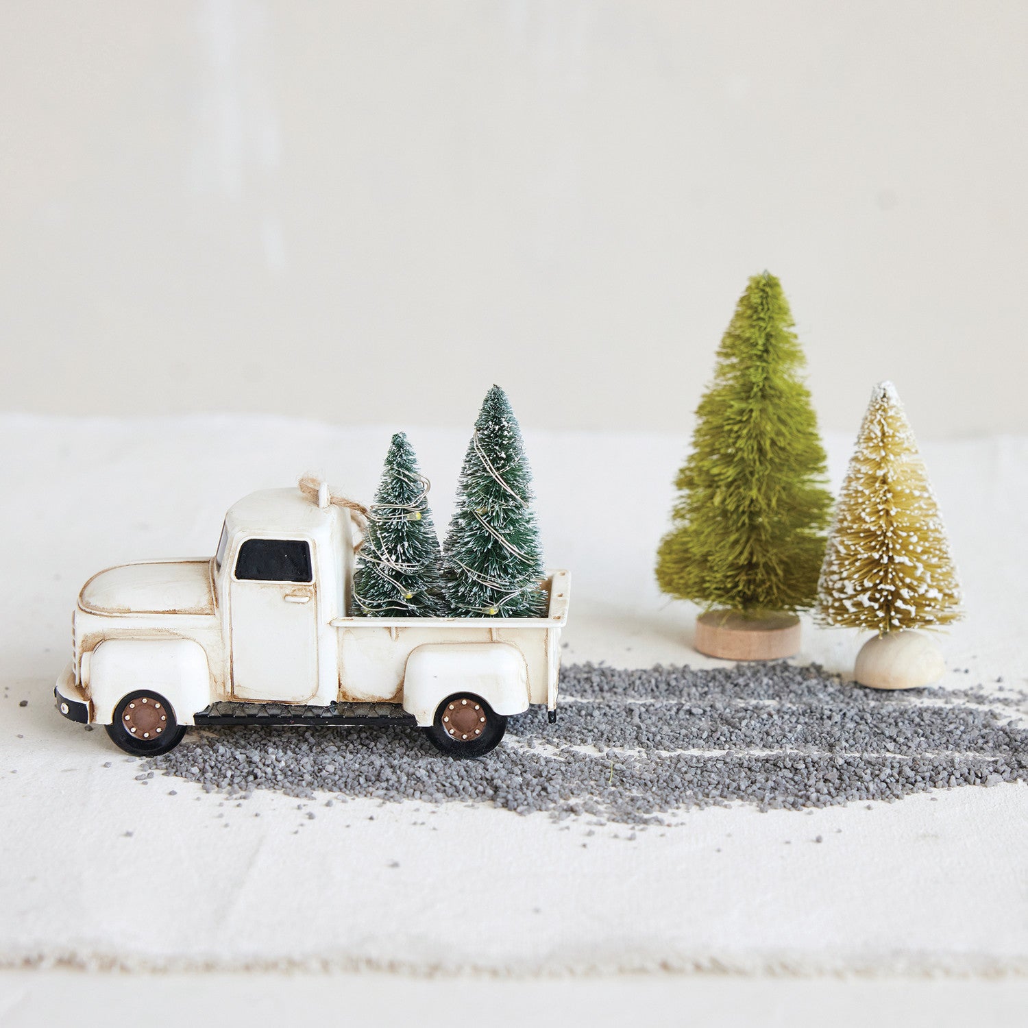 5"L x 2-1/4"W x 3-1/2"H Plastic Truck Ornament w/ Sisal Bottle Brush Trees & LED Light, White & Green (Requires 3-LR44 Batteries)