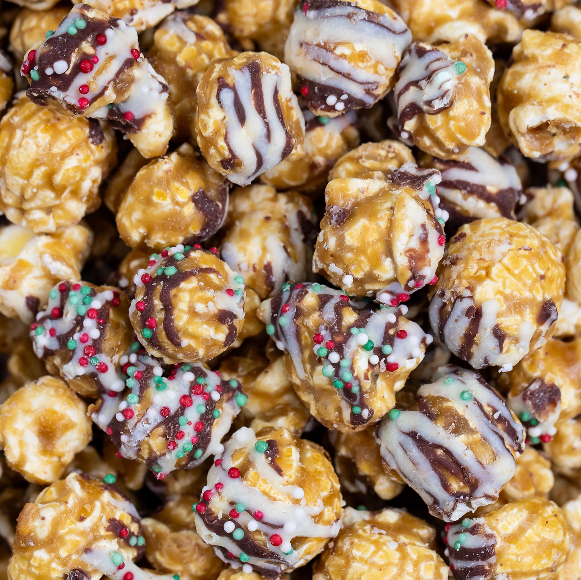 Bring festive cheer to your shelves with our Christmas Confetti popcorn. This holiday favorite combines our bestselling Salted Caramel popcorn with a drizzle of white and dark chocolatey coating, finished with colorful nonpareils.