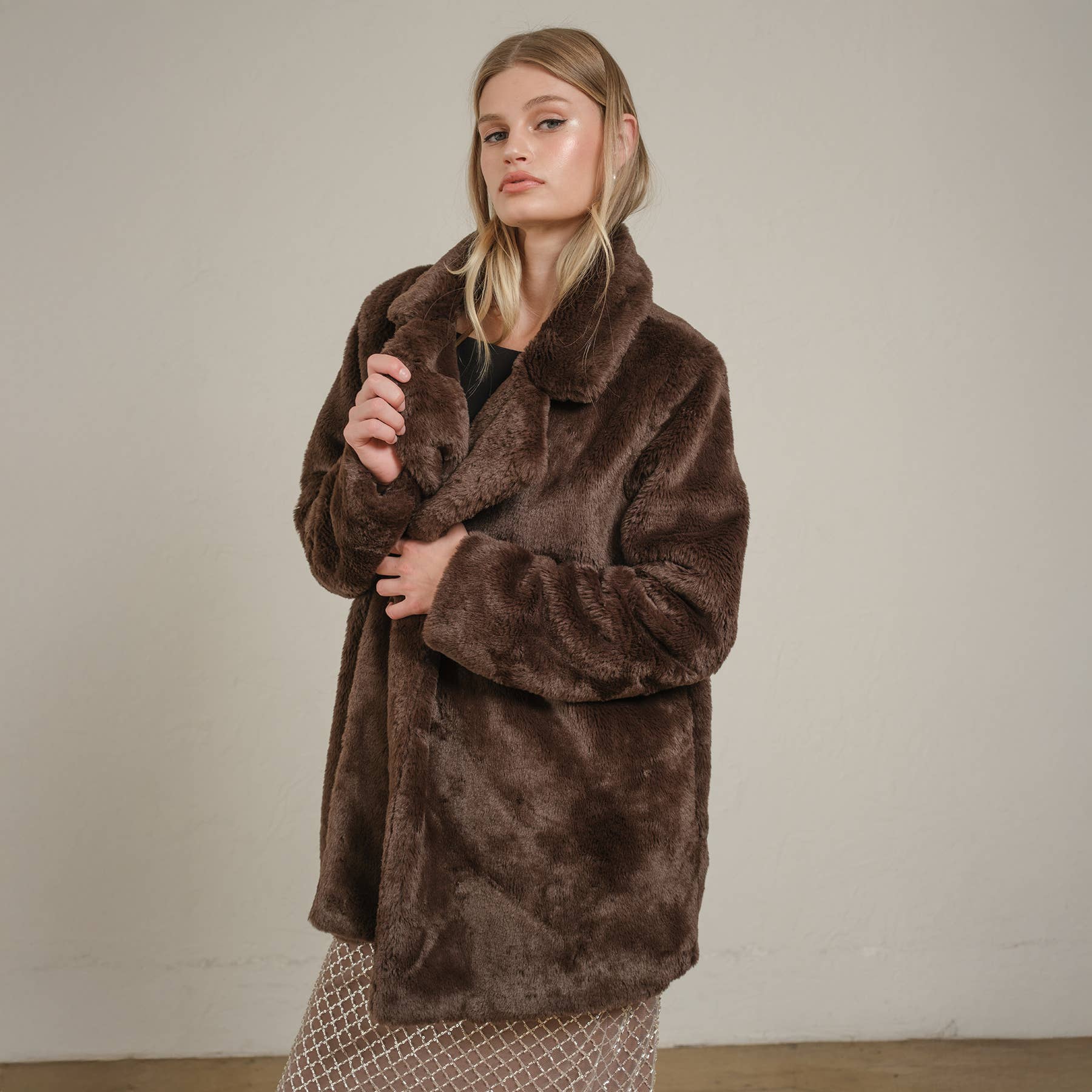 Cozy up in this chocolate faux fur open front jacket. Featuring a soft plush texture and a relaxed silhouette, this piece layers effortlessly over casual or dressy looks. Designed without buttons for an easy, modern feel, it’s the perfect outerwear to keep warm while looking chic during fall and winter. Side pockets complete the look with comfort and functionality.