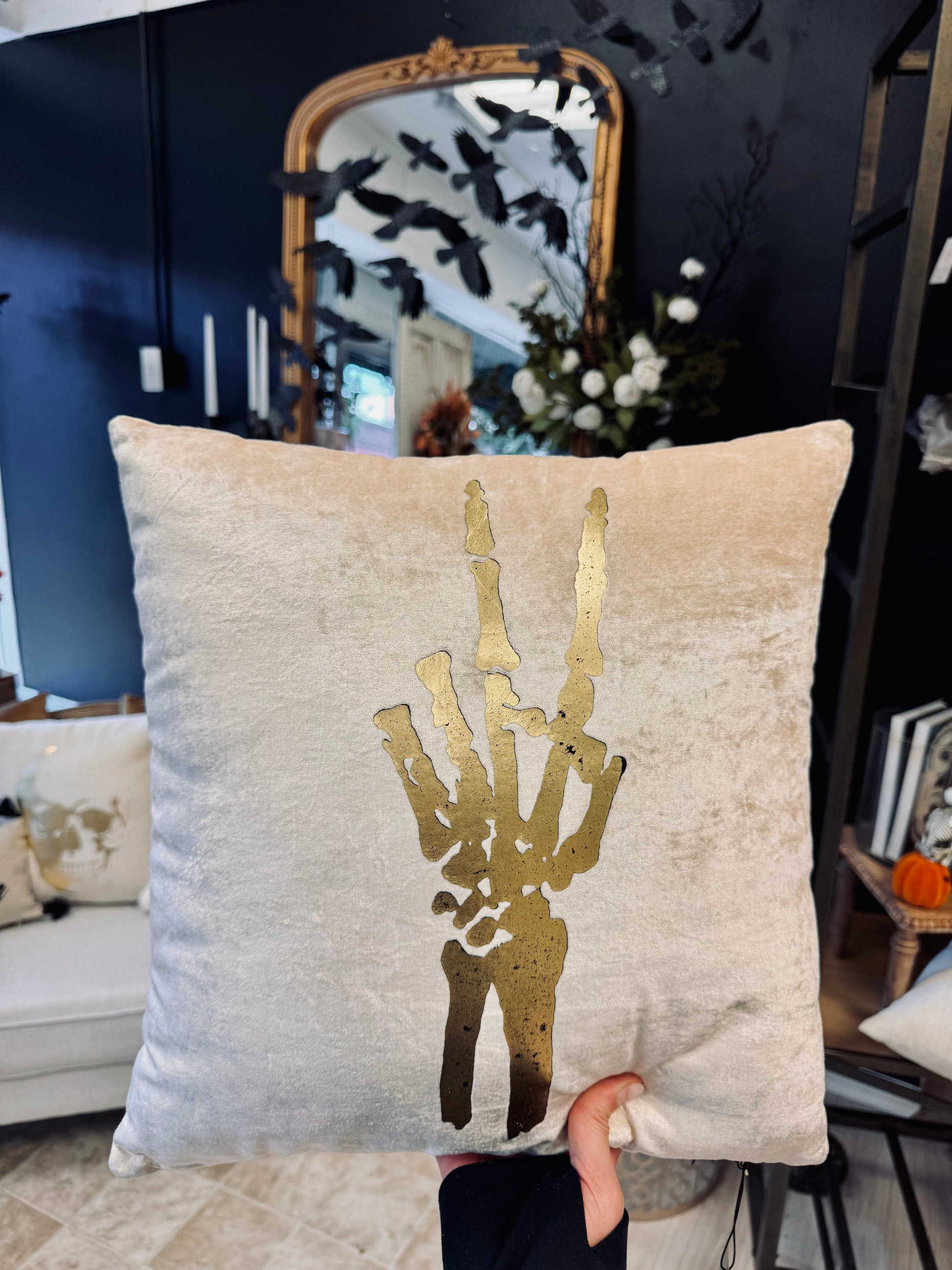 Material: Soft cotton velvet with a skeleton hand giving a peace sign printed in black and accented with gold foil