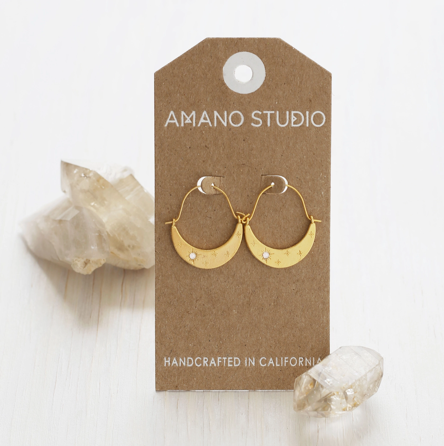 Inspired by the night sky as usual :) We took two of our best selling designs and combined them into one! This crescent is decorated with a sprinkling of starlight and one large "opal" sparkling star. 14k gold fill ear wires. Made of 14k gold plated brass. Designed and assembled in our Sonoma California studio.