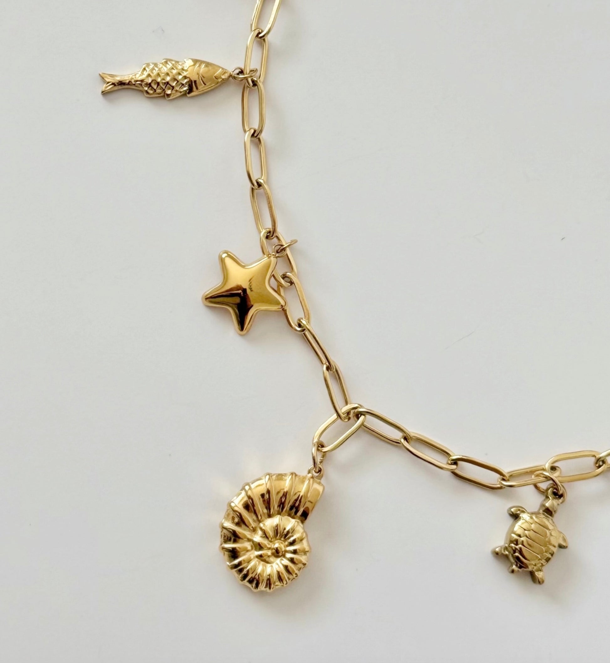 Our 7-charm necklace will be your new favourite featuring conch, fish, star, shell, turtle, pepper, and half moon. •Hypoallergenic •Nickel and Lead Free •Anti Tarnish •Water Resistant