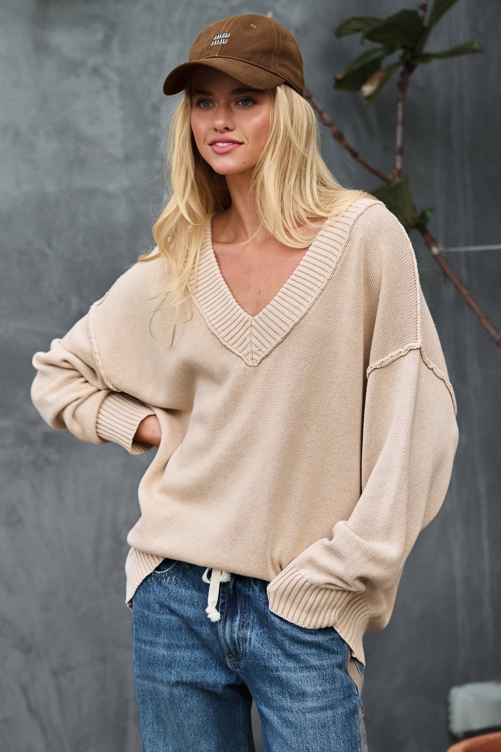 Urban Daizy - Contrast Trim V-Neck Cotton Sweater