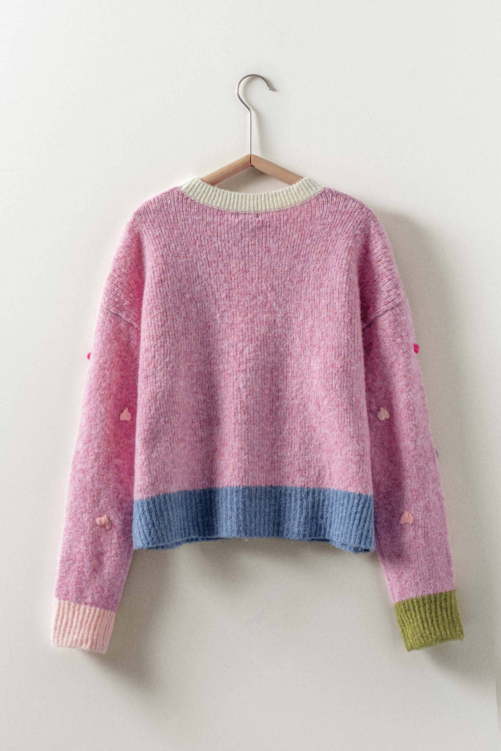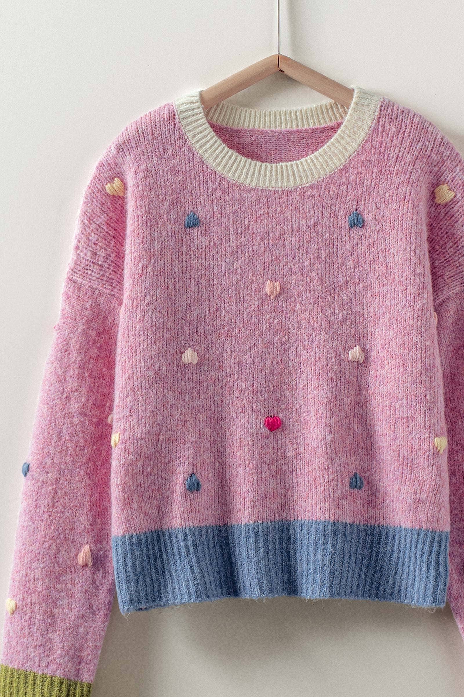 Urban Daizy - -A cozy, soft-knit sweater gets a playful update with this charming piece. It features all-over, multi-color embroidered hearts and a whimsical color block design on the ribbed trim, making it a sweet and cheerful statement.