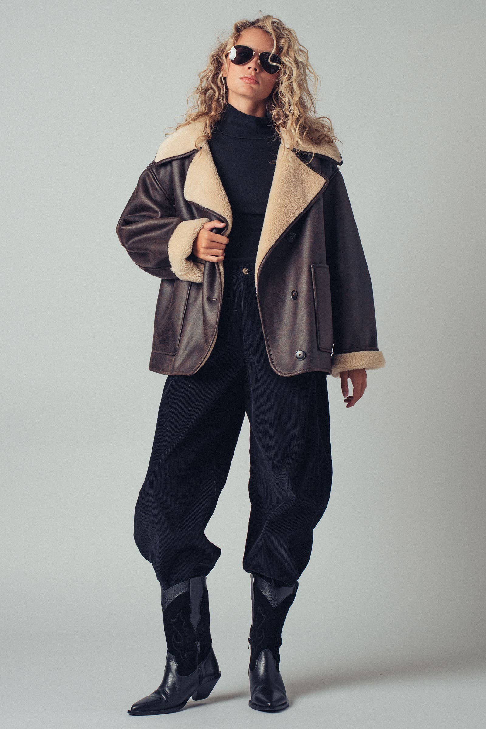 Urban Daizy - Oversized Aviator Jacket–Vegan Leather with Shearling Lining