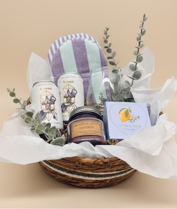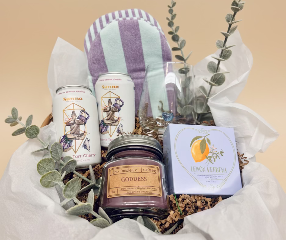 Two Sunna Wellness Elixirs, Creative Co Op European Pot Holder, blown glass heart wine glass & Heart Shaped Shea Butter Soap, Eco Candle Company soy candle mason jar in scent 'Goddess'. Eucalyptus stems add the finishing touch and items are displayed in a woven basket.
